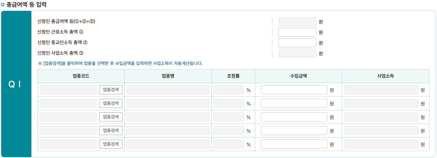소득에 대한 내용도 작성합니다. 단독가구면 1인, 부부라면 2인 모두 작성을 해야하고
