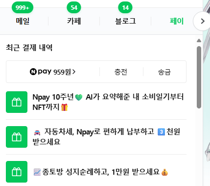 네이버 검색창에 '네이버페이' 를 검색해 들어가시거나, 우측 중단에 있는 페이 를 누르고 들어갑니다.